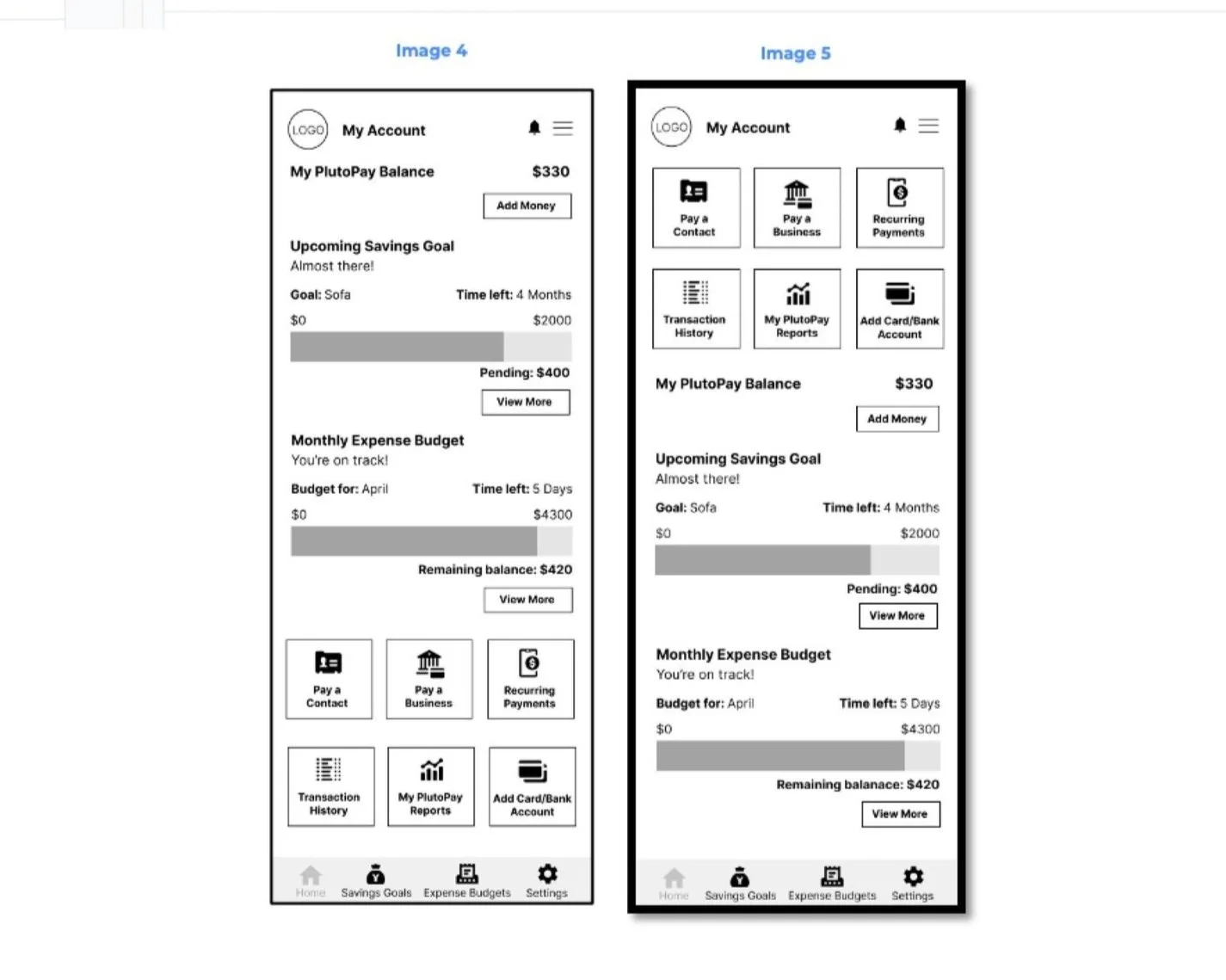 In the mid-fidelity prototype, users could use PlutoPay to meet their goals by completing these tasks: